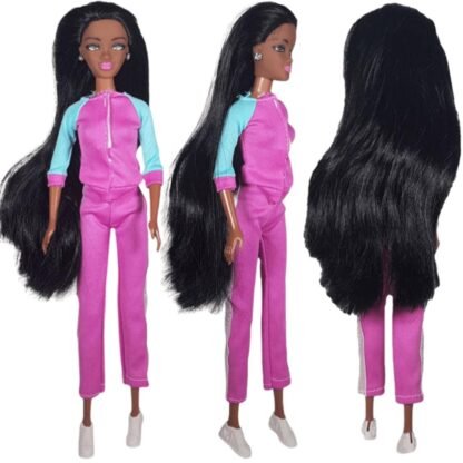 Amina doll wearing a pink hoodie tracksuit with white pumps.
