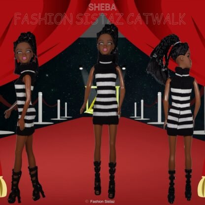 Sheba doll wearing a fantastic black & white sleeveless jumper dress with black knee high sandal boots.